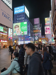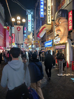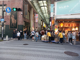 It’s about 7 PM, and I’ve ventured out again, looking for ramen, and I’ve found some in another one of those covered shopping streets near my hotel; they seem to be everywhere. The food here is remarkably inexpensive. The bowl of ramen is 860 yen, which is about $5.60 US; I estimate it couldn’t be had back home for less than $13. I’m getting pretty sick of paying $15 for 3 indifferent chicken wings in Portsmouth and beer for $8 a mug. I think the local restaurants charge it because they can get away with it. On the other hand, I definitely find the entire staff yelling “Irasshaimase” every time someone walks in a bit unnerving. I got something that has a broth made of simmered chicken bones and scallops, and it’s really good.