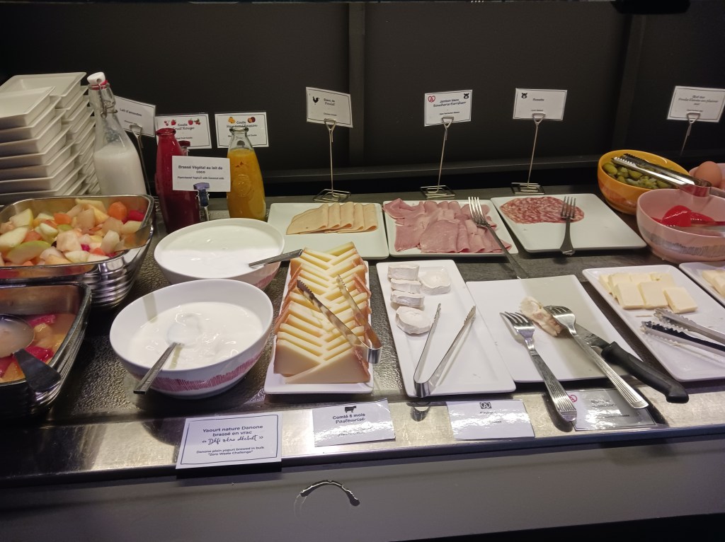Kay and I are staying in the Novotel Suites here in Colmar. Nice place, comfortable rooms, and helpful staff. The breakfast buffets here in the EU are way better than the free breakfast you might encounter at the Hampton Inn, where you get what I assume are eggs in the shape of a small yellow hockey puck, hot brown water they call coffee, and some depressed-looking breakfast sausages. Oh, I eat that stuff when I stay there on business trips; it is included, and it is food of a sort. But just this morning, here’s what awaited me downstairs: