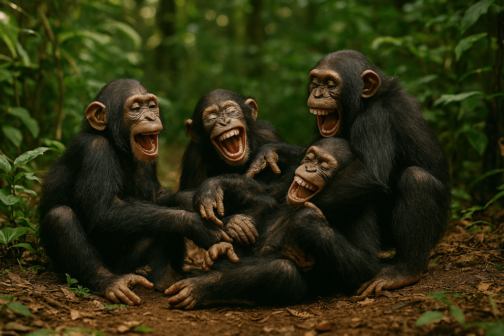 Animals laugh too. It turns out that laughter or something like it is seen in at least 65 species. If you’re playing with a dog, rubbing its belly and chasing it around the yard, that peculiar panting sound isn’t just labored breathing; it’s dog laughter. Rats will squeak and chirp when you tickle them, and it’s not just random rodent noise; it’s their version of giggling. Dolphins whistle and chirp at each other, and sometimes, those noises mean “this is fun, keep going!” Chimpanzees will pant and make hooting sounds when they roughhouse with friends, just like kids on the playground.