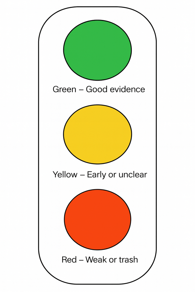 Use when there are small or limited studies, mixed expert opinion, or noticeable bias/cherry-picking. - 🔴 Red – Stop